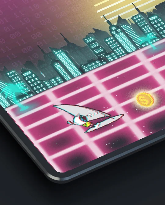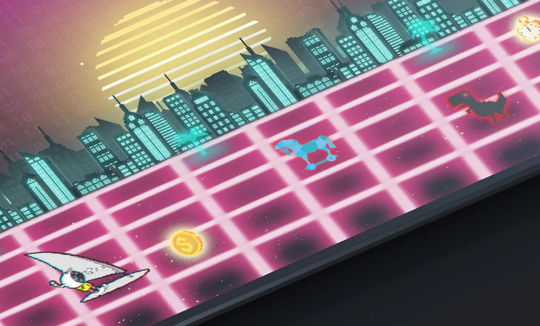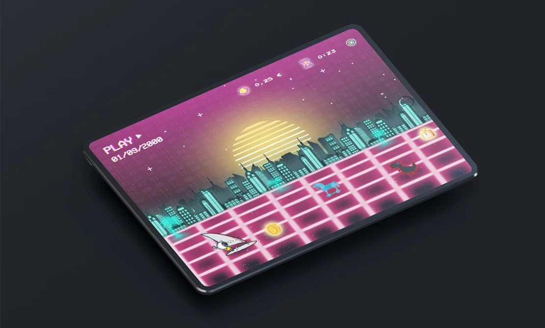 To mark our agency’s 20th anniversary, we created this retro endless runner. We wanted to celebrate the anniversary in a humorous way and take a trip back to a time when the internet was still ‘uncharted territory’. In keeping with our former motto ‘The eye surfs along’, players had to manoeuvre the first Netigo mascot through the pitfalls of the digital landscape and dodge viruses, bugs and adverts for as long as possible. For every coin collected in the game, we donated 25 cents to the Regenbogenland children’s hospice, a charity we have supported for a long time, for a good cause. A total of around 1,500 euros was raised. The retro anniversary game was built using HTML5 and is, of course, also playable on mobile devices.