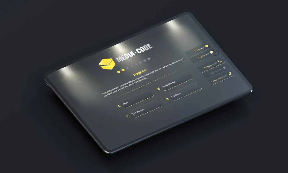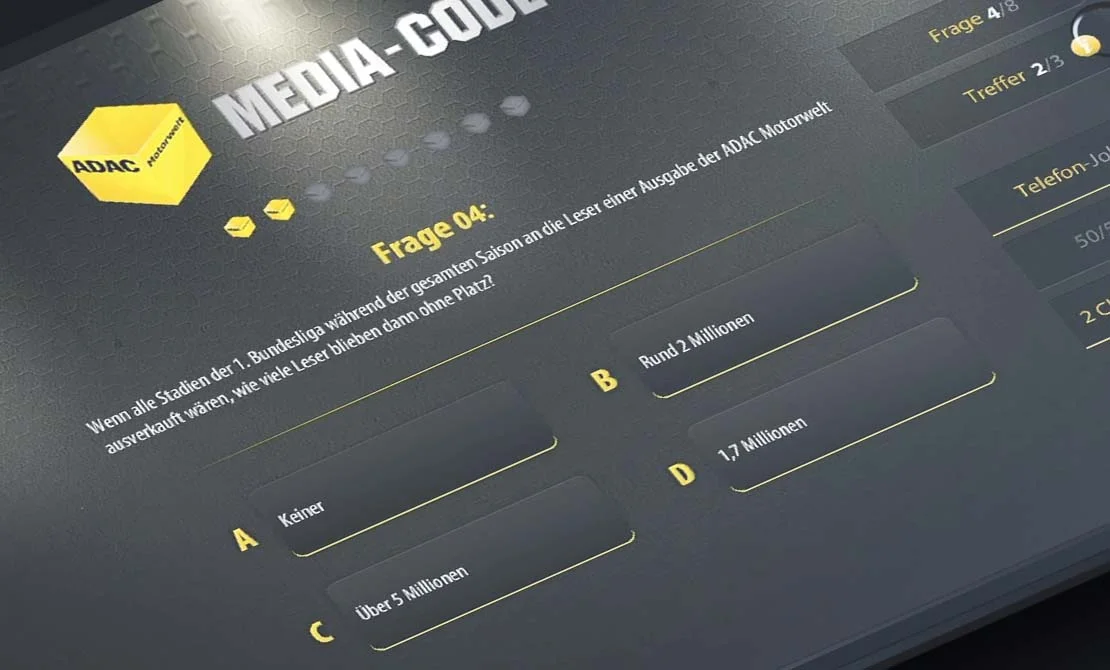 Bei dem Quiz konnten Media-Entscheider ihr Wissen zur ADAC Motorwelt testen und mussten den sog. Media Code entschlüsseln. Wer nicht alle Antworten wusste, konnte entsprechende Video-Joker zur Hilfe nehmen. Das Quiz lief in drei zeitlich versetzten Stufen ab und wurde von einer Mailing-Kampagne begleitet.