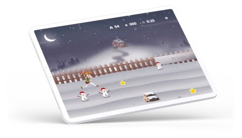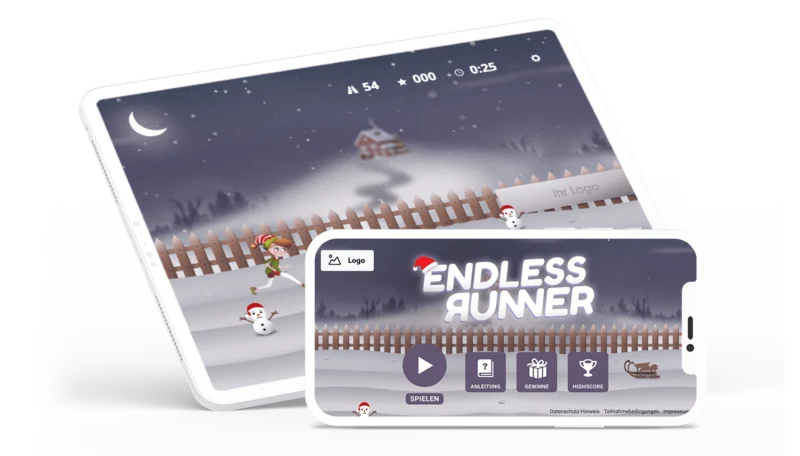 Endless Runner Xmas ist ein HTML5-Spiel, das auf Smartphones, Tablets und Desktop-Geräten direkt im Browser funktioniert. Es lässt sich nahtlos in eine Website, Landingpage, Weihnachts-Kampagne oder Social-Media Aktion integrieren. Mit weihnachtlichen Motiven, passenden Farben oder deinem eigenen Design wird das Spiel zu einem stimmungsvollen Bestandteil deiner Aktion.